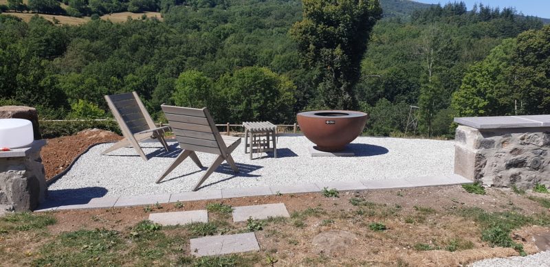 Construction d’une terrasse en gravier stabilisé, aménagement du tour de maison en pavés avec réalisation d’un escalier en pavés et d’un massif: